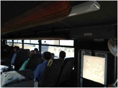 قبل أن أدلف إلى الباص، يقوم بعض الشباب بالتطوع لوضع الحقيبة داخل الباص وكتابة اسمي عليها دون أن ندفع أي مبلغ من المال كما يجري في الجانب المصري، فاستغرب كثيراً، لمجرد فكرة التطوع للتخفيف عن المسافرين.