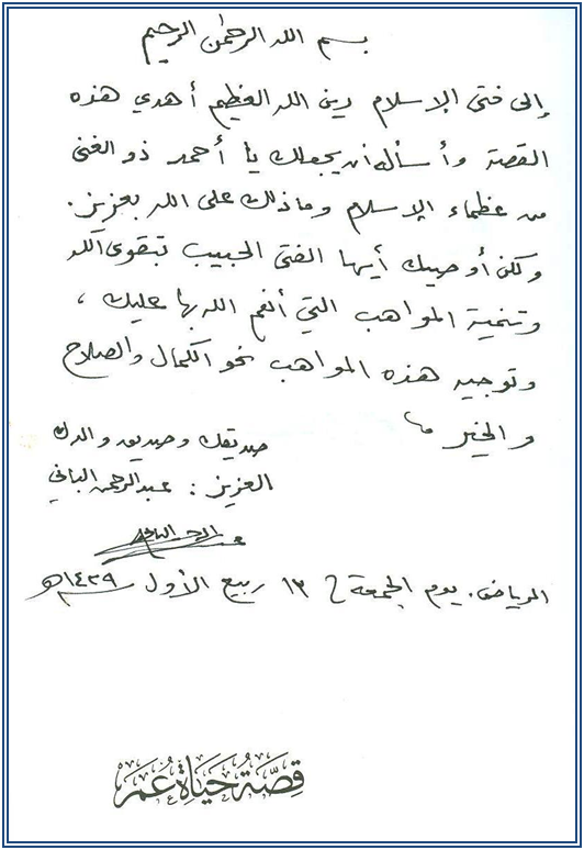 إهداء بخط الشيخ إلى ولدي أحمد، ويلاحَظ فيه التشجيع والتوجيه، وشدَّة التواضع بقوله: