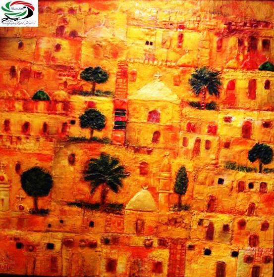 فضاء المكان: الوطن السليب لم يفارق الفنان في لوحاته، فالفنان من مدينة الرملة التي هُجر أهلها عام 1948 وهو نفس العام الذي ولد فيه الفنان في مدينة لم يستطع أن يراها بطفولته، لكنها كما الوطن لم تفارقه وهذا ما نلمسه من خلال مؤلفاته العديدة وأبحاثه كدكتور في العلوم السياسية، وما أذكره من حديثه عن الوطن في لقائنا الأول ربيع 1974 في بغداد حين كنت طالبا بالجامعة إبانها، وفي هذا المعرض شارك بخمسة من لوحاته عن المكان كان القاسم المشترك في أربعة من اللوحات مدينة القدس بمآذنها وأبراج كنائسها وبيوتها التراثية الضاربة القدم في تاريخها، إضافة أن لوحة من اللوحات الأربعة تميزت بوجود عبارات مكتوبة تمازجت مع المكان ومنحته قدسية خاصة (بسم الله الرحمن الرحيم، الحمد لله)، وإضافة للعبارات المكتوبة كانت هناك الرموز الكنعانية والمتوارثة عبر الآف السنين، ولم يغفل الفنان الرمز الفلسطيني الذي يرمز لحلم العودة وهو المفتاح، فمن المعروف أن الكثير حين أجبروا على الهجرة حملوا مفاتيح بيوتهم على أمل العودة القريبة والتي طالت كثيرا، فتوارث الأبناء والأحفاد هذه المفاتيح التي أصبح لها رمزية وقدسية خاصة، بينما اللوحة الخامسة من فضاء المكان كانت تختلف عن سابقاتها فقد صورت الطبيعة والأرض وشجر الزيتون بطريقة لافتة للنظر وليس مجرد مشهد طبيعي عابر، فعبرت بصمت عن الالتزام المتبادل بين الإنسان والأرض.