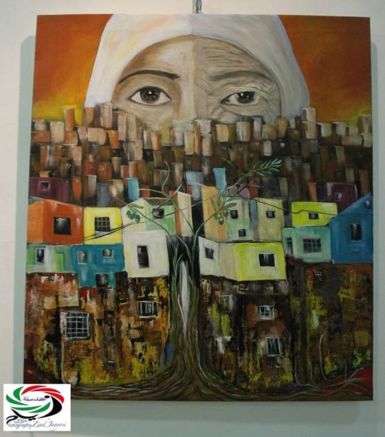 لوحة أخرى كانت مختلفة وتحمل رمزية عالية في هذه المجموعة وهي لوحة تمثل المكان التراثي مع مجموعة من الرمزيات، فشجرة الزيتون في المقدمة مرتفعة بأغصان مخضرة بأوراقها بدون كثافة، لكن جذورها تمتد على قاعدة مساحة المكان الذي يمثل وطنا يرمز له ببلدة تراثية بمبانيها، ويلاحظ في نصف المباني التراثية وجود مجموعة من الابنية تخرج بشكل مختلف عن باقي الأبنية، فهي ملونة بألوان الفرح وتختلف عن الوان وأشكال البيوت التراثية التقليدية وكأنا رمزية واشارة ان الجيل القديم يتجدد بأجيال شابة ستخلق الفرح وتزيل الالم عما سبق، وفي افق اللوحة نجد وجها لامرأة يأخذ ثلث اللوحة، ولكن من يدقق الوجه يجده يمثل جيلين، نصف الوجه شاب والآخر كهل غزته التجاعيد، وهي رمزية واضحة لانتقال القضية من جيل الى جيل وهي في الوجدان كما جذور الزيتون راسخة في الارض وممتدة للوطن بأكمله، فهي قضية لا تموت ولن تموت، والافق والسماء باللون الذي يكاد يشتعل نارا، وكأنه رمزية لافق ثورة آتية، فالنور فوق المباني وتحت الأفق باللون الأصفر الممثل لاشراقة جديدة.