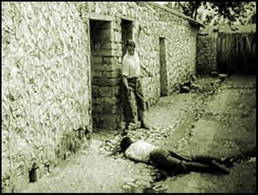 (جندي فرنسي ينفّذ الإعدامات بمسدسه بحق الجزائريين العُزّل ويلقيهم في حفرة)