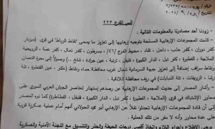 وفي برقية أخرى صادرة عن فرع فلسطين (الفرع 235) التابع لشعبة المخابرات العسكرية ومرسلة إلى فرع الأمن العسكري في اللاذقية (الفرع 223) وأفرع الأمن العسكري في كل من حلب وحماة وإدلب أيضا، بتاريخ 28 أيلول (سبتمبر) يبلغ رئيس فرع فلسطين من خلالها باقي رؤساء الأفرع بالمحافظات بأن فصائل المعارضة وجهت عناصرها إلى «تعزيز نقاط الرباط في قرى (ميزناز، كفر نوران، كفر حلب، داعل، تقاد، محيط الفوج 46 في الأتارب، بسرطون، كفر تعال، كفر عمة، الرويحة، الملاجة، الفطيرة، كفرنبل، الدار الكبيرة، فليفل، الترنبة، عين جرادة وشلخ..) وصولا إلى معرة نعمان ونقاط سراقب. إضافة إلى تعزيز جبهة السرمانية شمال غرب محافظة حماة ونقاط (عكو، عين القنطرة، تلة رشا، الزريقات، تلة الدبابات) في ريف محافظة اللاذقية.