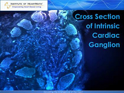 وفي هذه الصورةِ : مقطعٌ في الخلايا العصبيةِ للقلب ، وهي خلايا عددُها أكثرُ من 40000 خلية، ويؤكدُ بعضُ الأطباءِ "الشجعانِ" أنَّ هذه الخلايا مسؤولةٌ عن التفكير وعن توجيهِ الدماغِ ولها دورٌ كبيرٌ في التحكمِ بكلِّ الجسدِ! ومنهم البروفسور Gary Schwart الذي وثَّق عشراتِ الحالاتِ التي تُثبِتُ أنَّ للقلبِ دوراً كبيراً في التحكمِ بشخصيةِ الإنسانِ وأفعالِه وذكرياتِه، بل إنَّ القلبَ هو الذي يُحددُ مستوى الإيمانِ أو الكفرِ لدى الإنسان .